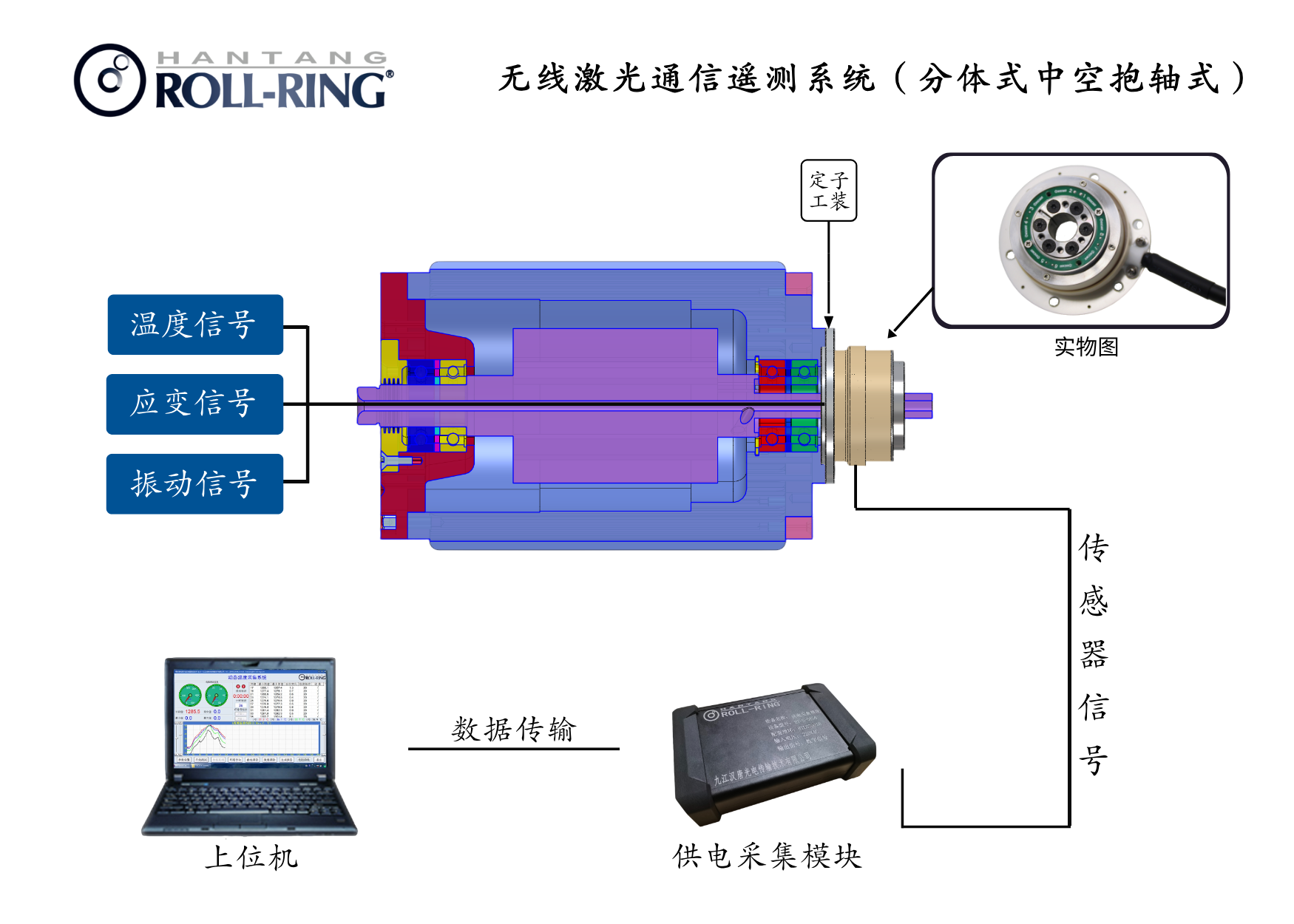 HTFKL2213-K04-G20分体式无线激光通信遥测汉唐团队综合新能源汽车驱动电机研制过程中,需要对驱动电机转子进行长时间动态监测的需求上,在总结汉唐原有的“无线激光通信遥测技术”的经验基础上,自主设计了一款“分体式中空抱轴无线激光通信遥测系统”,其原理是从被测转子采集到的传感器信号通过光为载体、空气为介质发送给定子的光接收,将光信号调制与解调成电信号通过连接器方式输出,实现高速转子非接触信号传输。