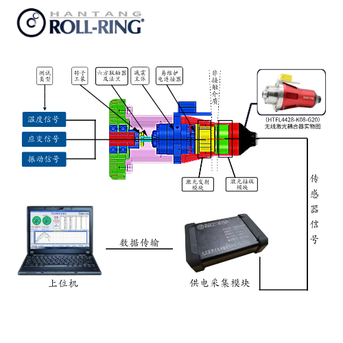 HTFL4428-K08-G20轴端减震式无线激光通信遥测基于汉唐高速滑环的研发和高速转子测温应用积累的大量试验数据,根据用户不同工作场景的测温需求,我司特研发此款轴端减震式高速无线激光通信遥测。采用航天级标准设计生产,为了避免在单次高昂的测试中,因产品损坏对测试造成损失。产品本身拥有汉唐独家设计(六方联轴器)的减震结构,可容许1.5mm轴向窜动、0.5mm径向窜动、80G振动,且旋转传输过程中,设备的转子端不承受其产品的重量,所以其旋转轴的转动惯量极低(2.78X10^-5 kg·m²)。该原理是将温度信号从被测转子采集并转换为数字信号通过光为载体、空气为介质旋转状态下发送给定子的光接收,将光信号调制与解调成电信号通过连接器方式输出,实现高速转子非接触温度信号传输。